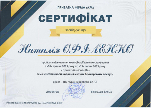 Викладачі кафедри товарознавства, біотехнології, експертизи та митної справи пройшли підвищення кваліфікації шляхом стажування з 05 травня 2025 року по 15 липня 2025 року у Приватній фірмі «КМ» (м.Полтава), загальний обсяг – 180 годин/ 6 кредитів ЄКТС. Тема підвищення кваліфікації: «Особливості надання митних брокерських послуг»».